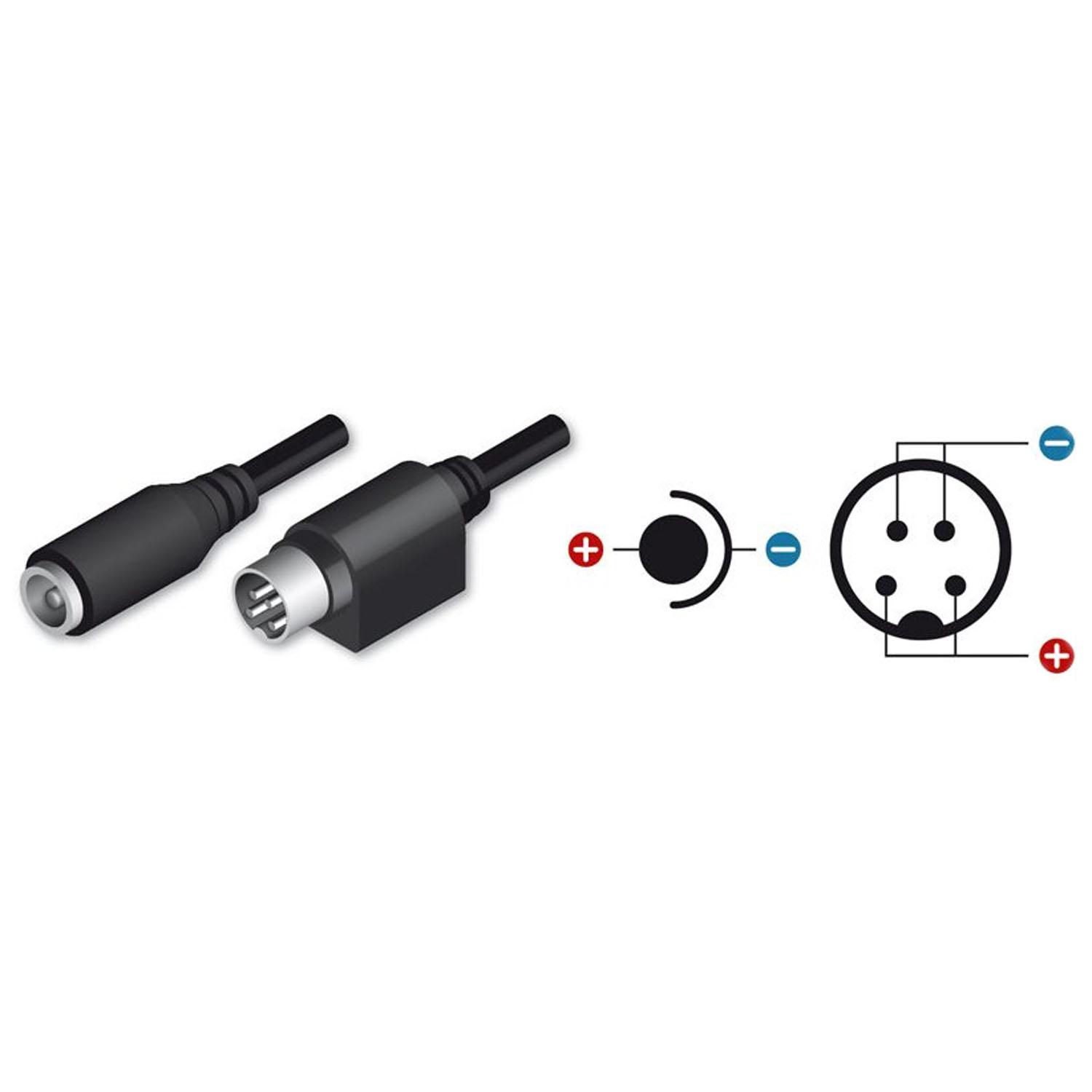 It has a male power input Mini Din 4 pin, and 1 standard male power supply output. It permits you to use a power supply with standard output in the devices whose power supply input is a connector Mini Din of 4 pins, such as a power supply DC 12 V in the recorders of the SAFIRE range.