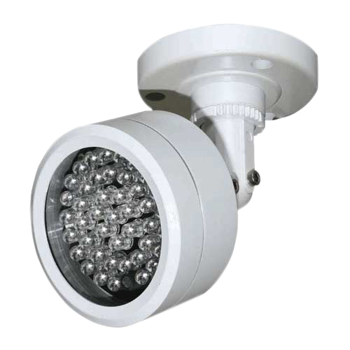Water resistant and IP65, certified for both interior and exterior use. Fitted with a photocell light detector to switch on the IR illumination when the lighting conditions are low. Thereby its 4 IR LED's activate automatically and provide the infrared illumination necessary for security cameras to function in low light conditions. Beam width 60º.