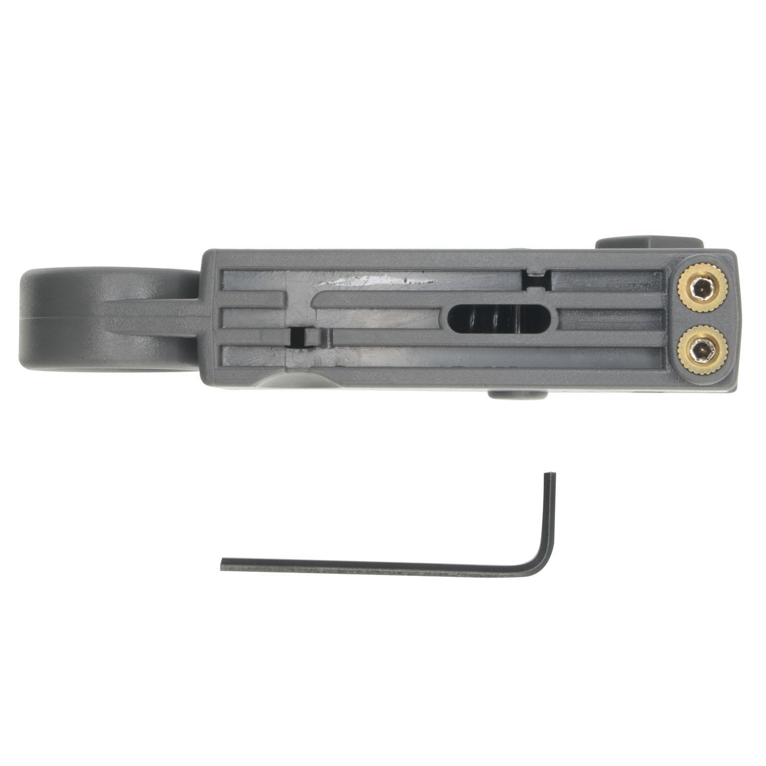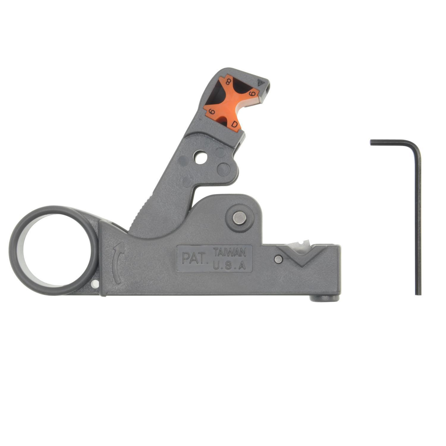It has an interchangeable accessory that permits to cut cables of different types, including RG6, RG58, RG59 and RG62. It has two blades. Through an included allen wrench it is possible to vary the depth of cut made. And changing the position of the blades it is possible to vary the length of the cut made, it may be of 4, 6, 8 or 12 mm.