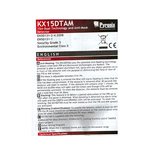 | Technology | 1 x PIR + 1 x Microwave with AND/OR function |
