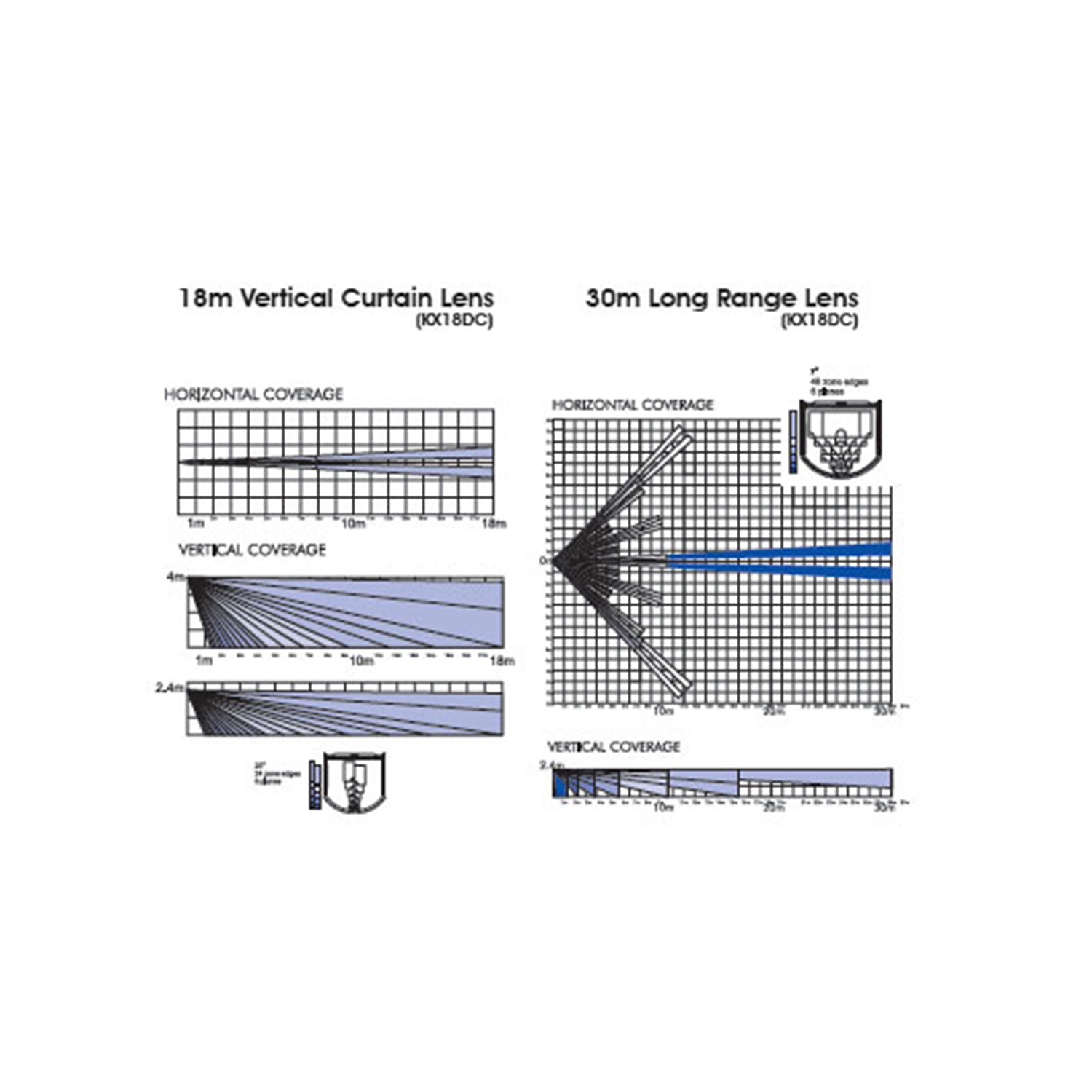 - Long range lens with 46 zones & 6 planes (15m in 90º with beam dimensions of 30m for H = 2.4m)