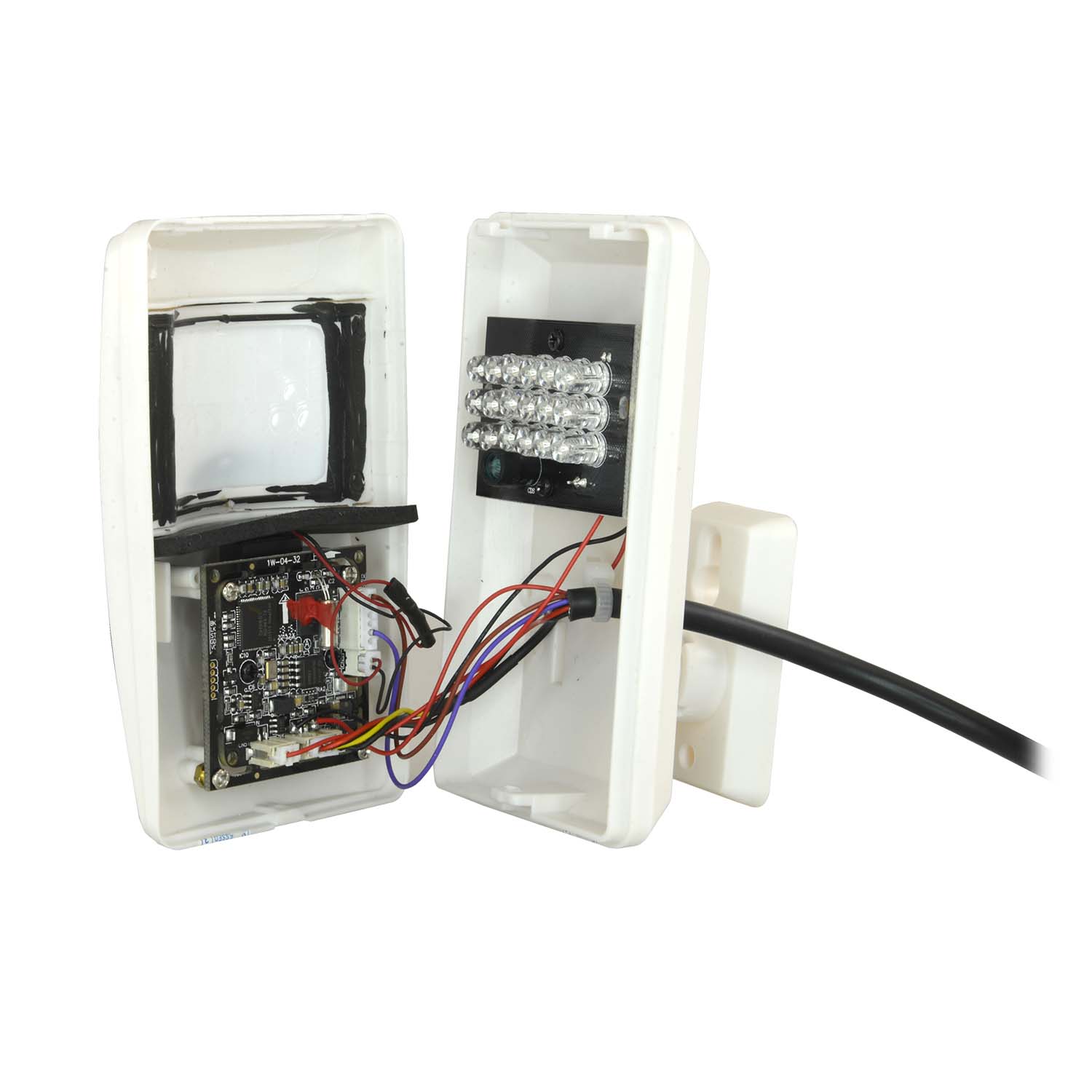 Consisting of a 1/2.9" Sony© 2.12 Megapixel Exmor sensor (model IMX322) and DSP (model V30), which offers a resolution of 1080p at 25 FPS. 3.7mm fixed Pinhole lens with a diagonal FOV of 79º. 18 infrared LEDs that are activated automatically providing a sharp image at 0 Lux (total darkness) at a maximum distance of 10 m. The IR LED's are behind the simulated PIR lens. When activated they simulate the illumination of a real PIR Detector. It has automatic IR Cut filter that permits clear, real colour, daytime images.